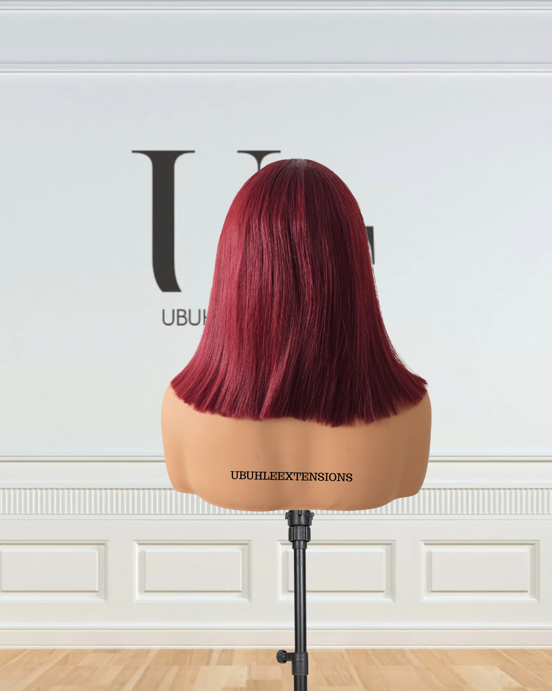 Miss Burgundy Bob is a blended wig made of synthetic and human hair. It's a 13X4 frontal lace 10 inch wig. 200% Density